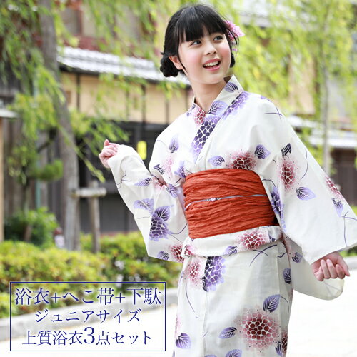 【最大1000円OFFクーポン】浴衣 セット ジュニア レディース 変わり織り綿浴衣3点セット 「クリーム地に紫・赤の紫陽花」 へこ帯 Sサイズ 2020 浴衣セット ジュニア 子供 レトロ モダン 150cm 140cm